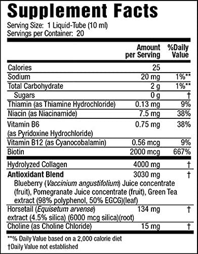 Hydrolyzed Collagen: a full 4,000 mg to help replenish the body?s supply of collagen. Biotin: a full 500 mcg per serving. Biotin is a water-soluble vitamin essential for normal cellular functions.