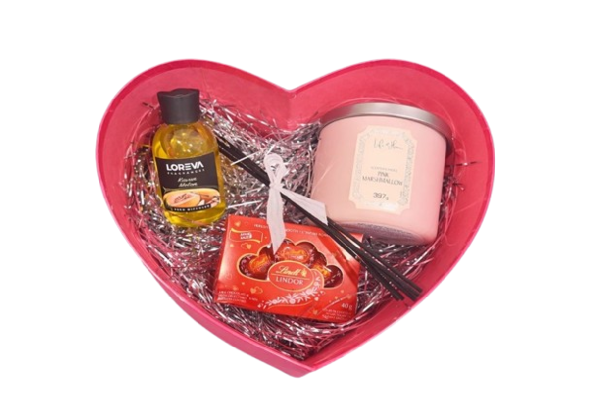 - Luxury Romantic Gift Set – Thoughtfully curated heart-shaped gift box featuring a fragrance diffuser, pink marshmallow candle, and Lindt chocolates for a complete gifting experience.