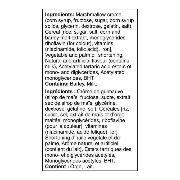 ?Toasted rice cereal (rice, sugar, salt, malt flavor, niacinamide, reduced iron, vitamin B2 [riboflavin], folic acid), corn syrup, fructose, vegetable oil (soybean and palm oil with TBHQ for freshness), sugar, corn syrup solids. Contains 2% or less of vegetable glycerin, dextrose, gelatin, natural and artificial flavors (contains milk), salt, DATEM, acetylated monoglycerides, soy lecithin, BHT for freshness.