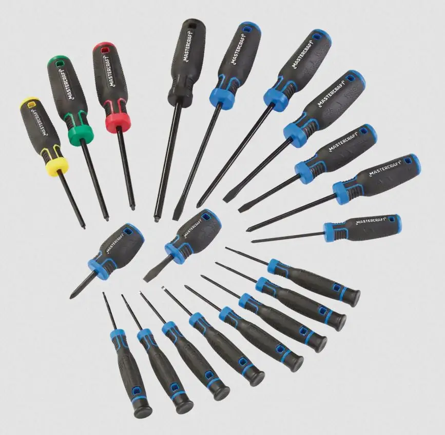 Mastercraft Screwdriver Set features contoured triangular handles that prevents driver from rolling and provides a firm grip for increased torque