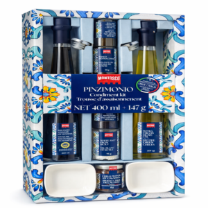 Montosco Pinzimonio Italian Condiment Gift Set – Extra Virgin Olive Oil, Balsamic Vinegar of Modena, Pepper Grinder, Sicilian White Salt, Calabrian Chili & 4 Ceramic Dipping Bowls