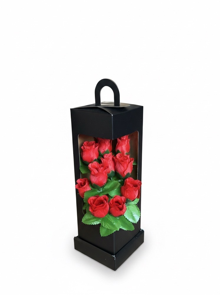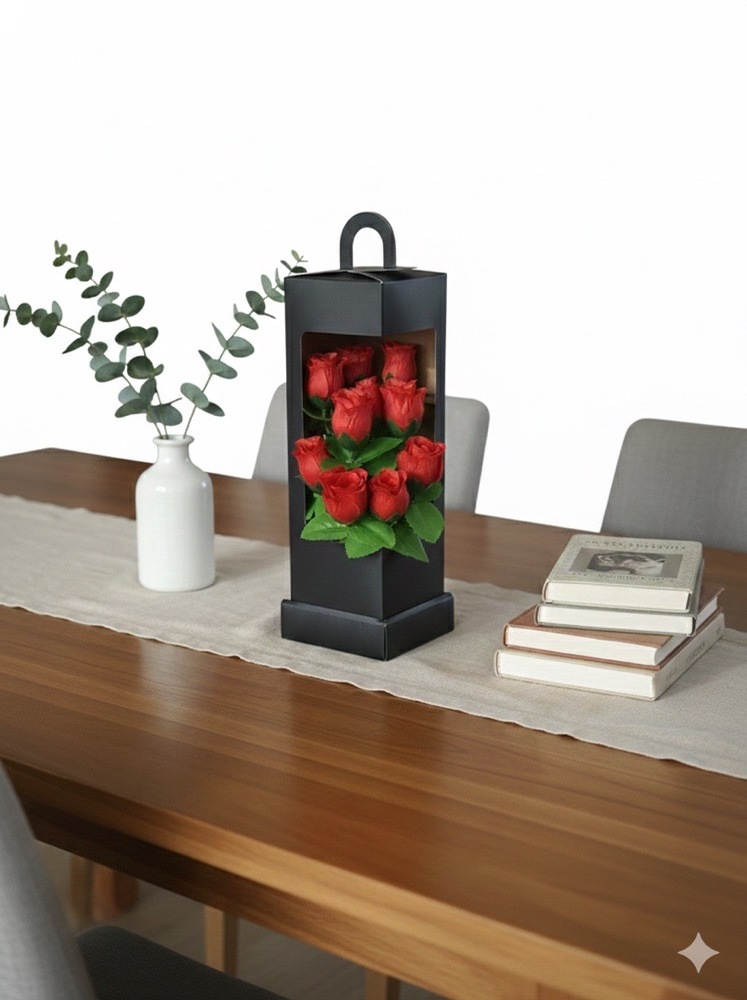 • Elegant Floral Gift Set – Beautiful bouquet pack featuring 10 artificial red roses arranged in a stylish gift box.