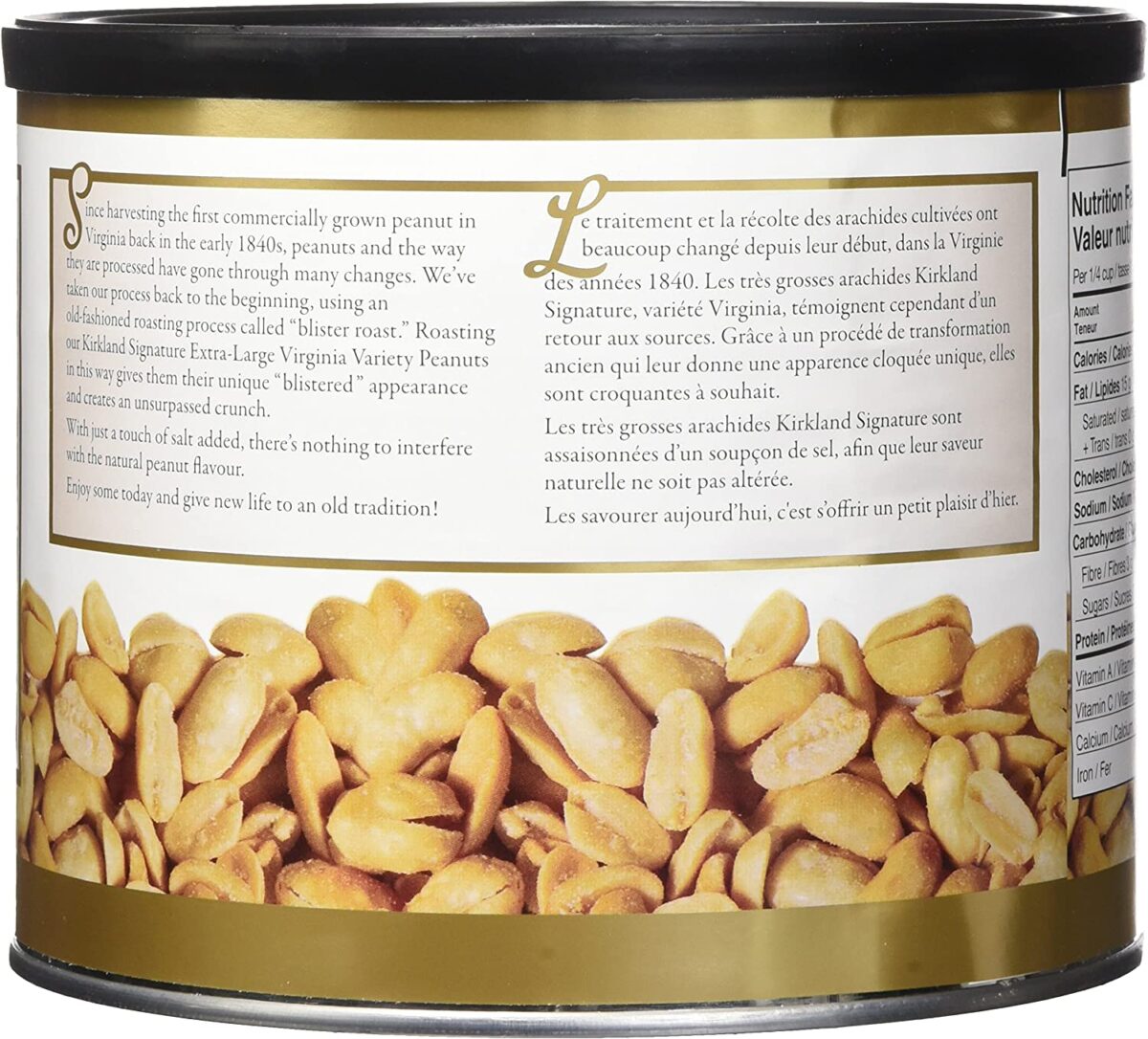 Kirkland Signature Super Extra-Large Peanuts are roasted in peanut oil and lightly tossed in salt to achieve a superior taste and texture. Virginia variety peanuts are packaged in the U.S.A in a re-sealable tin to keep them whole during transport and to ensure that the nuts retain their freshness once opened at home