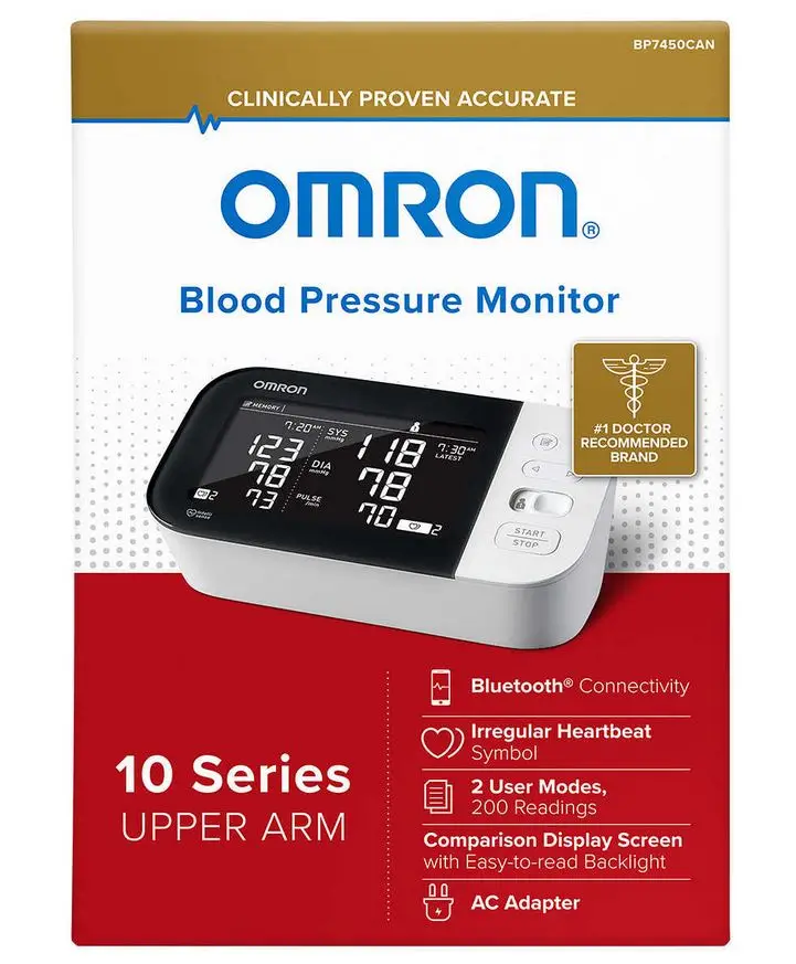 The OMRON BP7455CAN 10 Series Wireless Bluetooth Upper Arm home blood pressure monitor has a horizontally designed dual-display monitor and stores up to 200 readings for two users (100 per user), and includes a pre-formed Easy-Wrap Comfit Cuff (fits arms 9? to 17?; 22 to 42 cm in circumference).